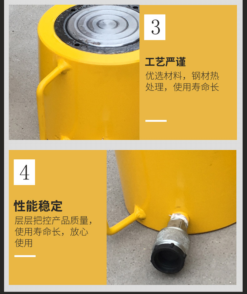 6、千斤頂將重物頂升后,應(yīng)及時用支撐物將重物支撐牢固,禁止將千斤頂作為支撐物使用。如需長時間支撐重物請選用CLL自鎖式千斤頂 。